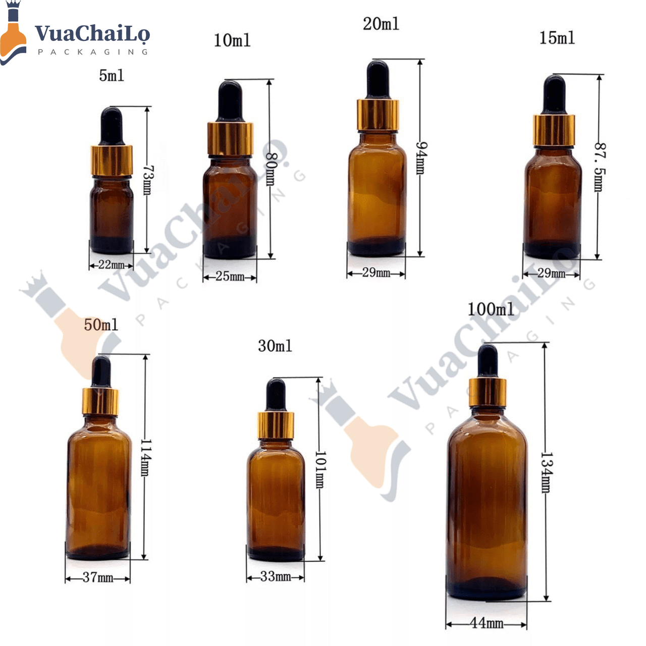 b. Chai màu nâu, dung tích từ 5ml; 10ml; 15ml; 20ml; 30ml; 50ml và 100ml